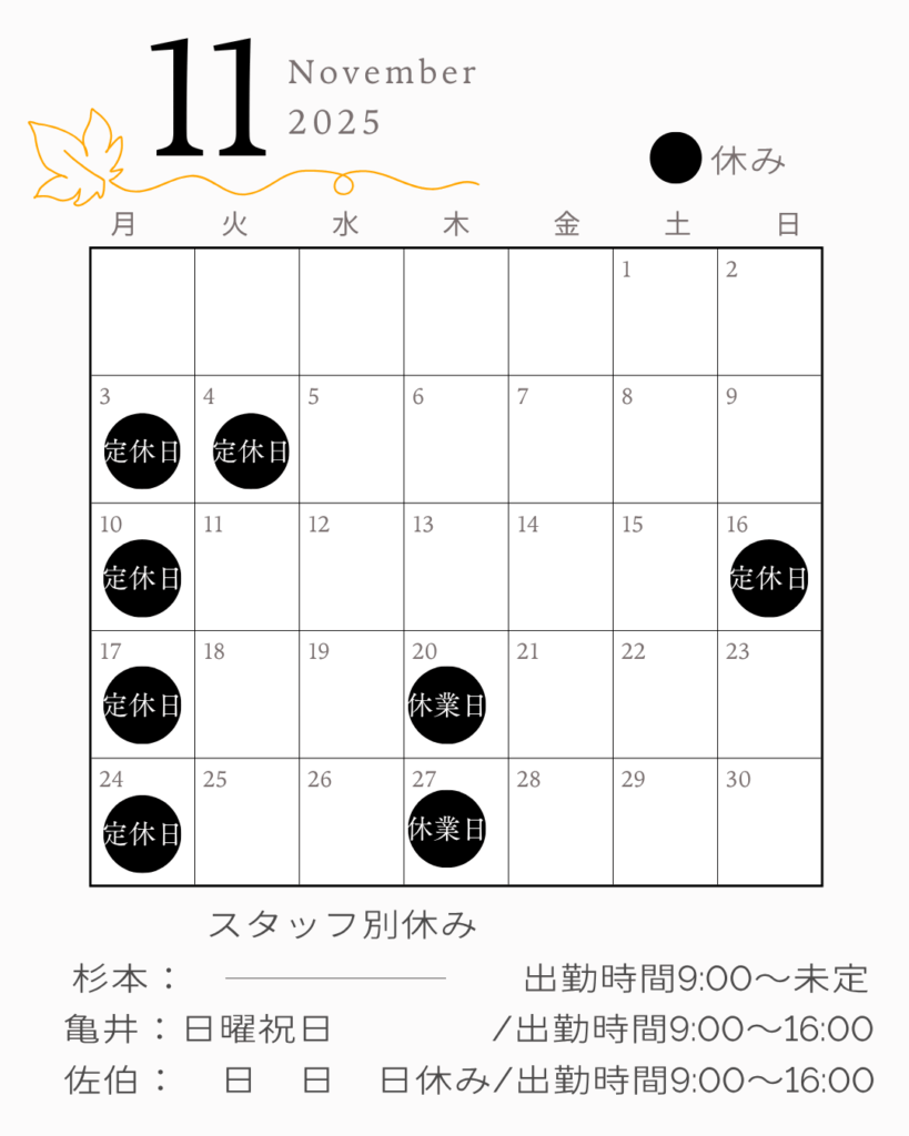 スタッフ別のお休みが追加される場合があります。ご了承くださいますようお願い申し上げます。