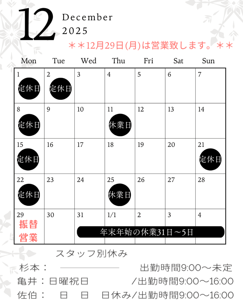 ***冬期休暇日程都合により、12月29日(月)は振替営業致します。***