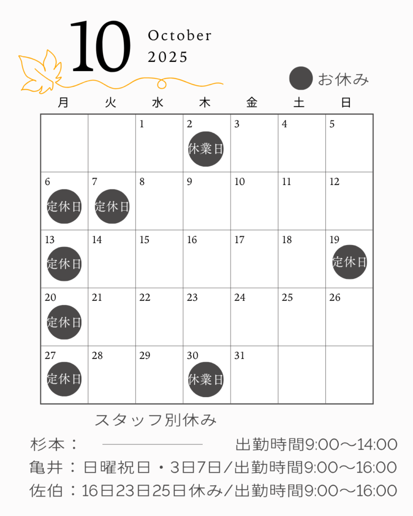 スタッフ別のお休みが追加される場合があります。ご了承くださいますようお願い申し上げます。